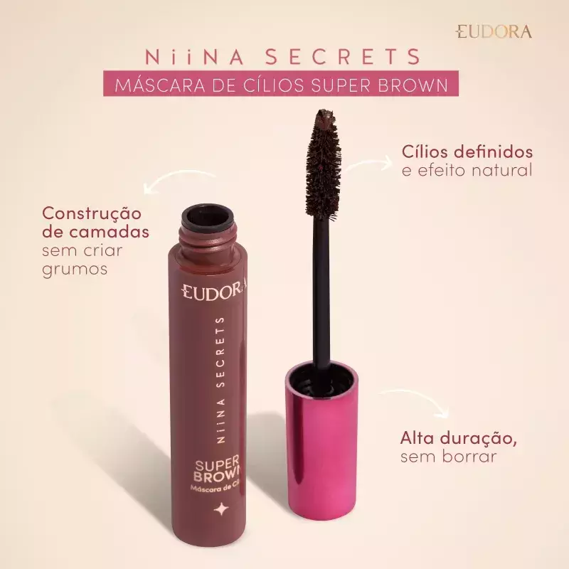A Máscara de Cílios Super Brown da Niina Secrets chegou pra revolucionar sua maquiagem do dia a dia com um tom marrom escuro super elegante que realça o olhar sem pesar. Ideal pra quem ama um visual mais natural, fresh e moderno! 🧡